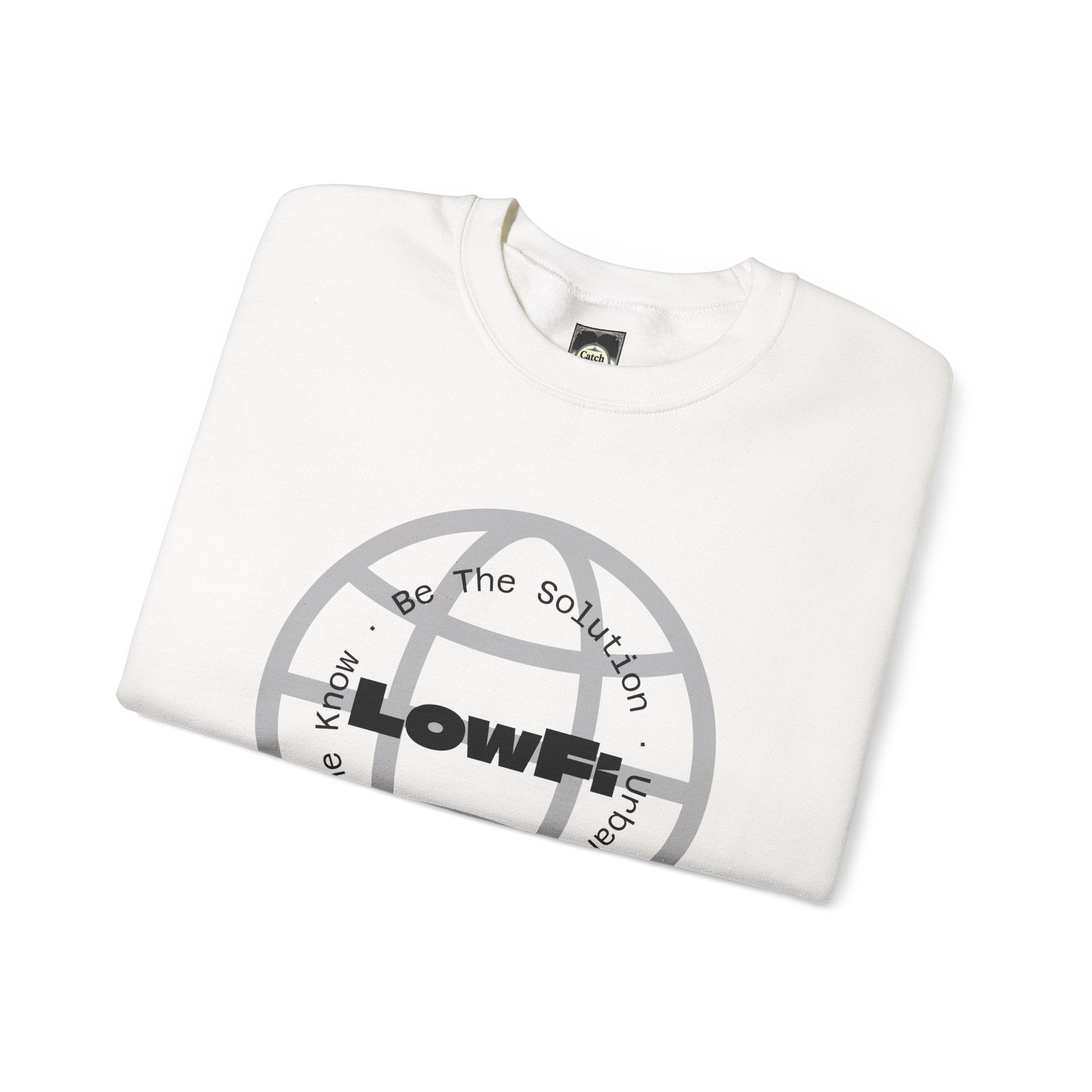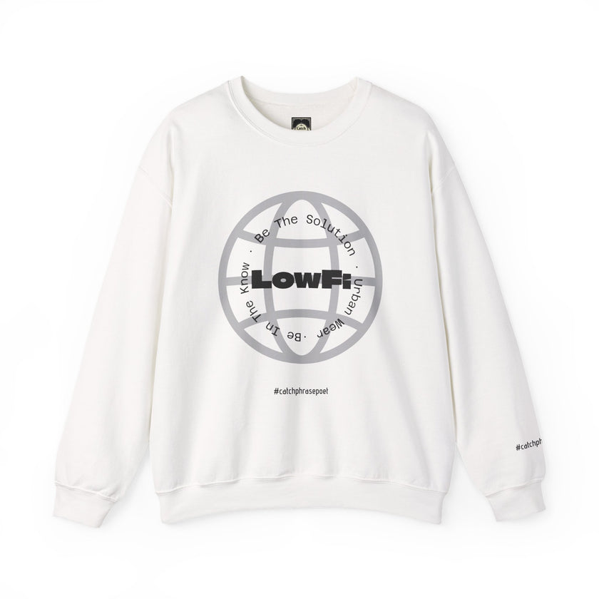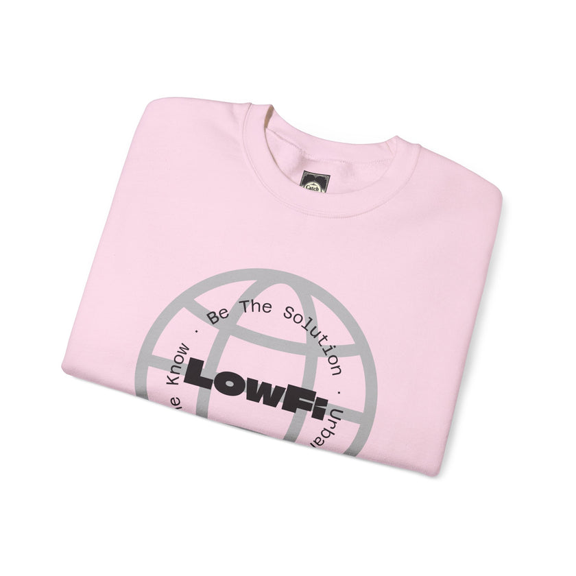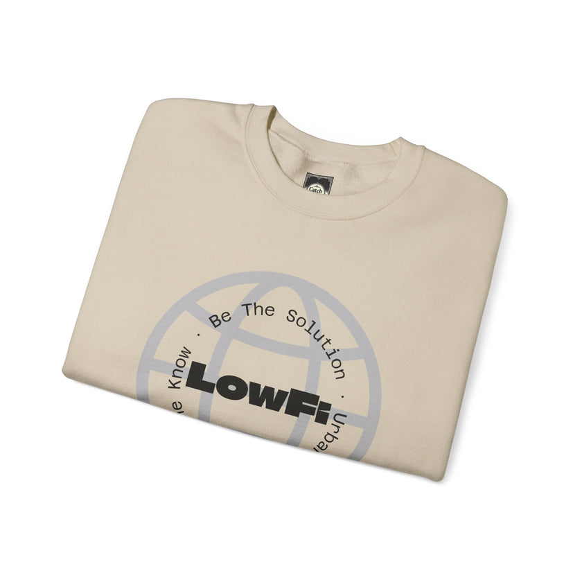 This crewneck sweatshirt brings a gritty, urban energy to everyday wear. The “LowFi” globe graphic spins like a scratched vinyl record, while the subtle “Be The Solution” message sits woven into the streetwise design—quiet confidence for people who move through the city with purpose. Mid-weight and structured, the sweatshirt wears like a reliable layer on cool evenings: crisp at the collar, soft at the touch, built to last through subway rides, late-night meetups, and weekend studio sessions. The tubular knit and ribbed collar keep the silhouette clean and the fit steady. Thoughtful production details—embroidered chest and wrist placement options, printed inner neck labels, and OEKO-TEX dyed fabric from ethically grown cotton—make this piece feel considered, not disposable. Slide it on after a long day and it settles in like an old favorite, carrying the mood of street tees and the comfort of a familiar sweatshirt.